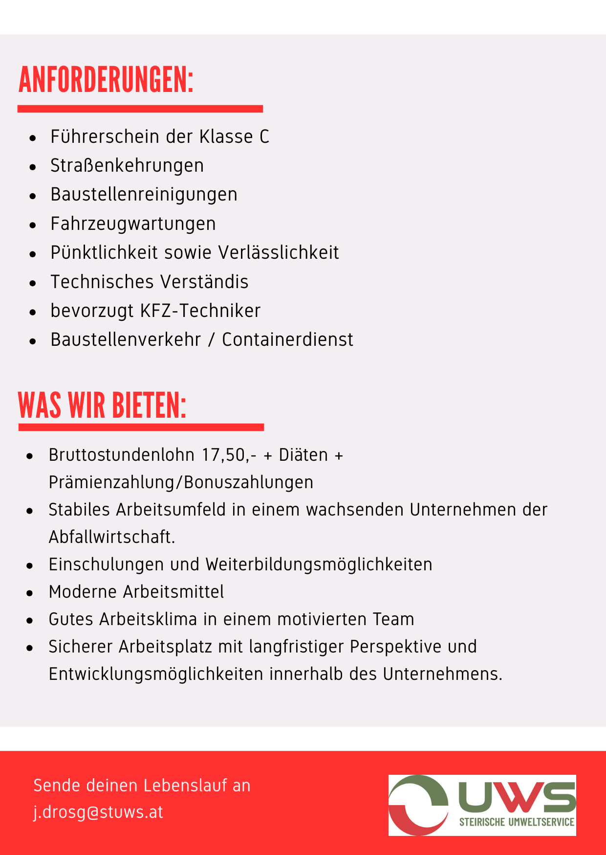 "Ab hier übernehmen wir" - diesem Leitspruch hat sich die Steirische Umweltservice GmbH, kurz UWS genannt, verschrieben. Wenige beschäftigen sich gerne mit der Beseitigung von Bauabfällen, aber wir übernehmen das für Sie. Von der Entsorgungsplanung bis zur Deponierung bzw. Wiederverwertung – unser erfahrenes Team berät Sie gerne und findet Ihre individuelle und wirtschaftliche Lösung, um Bauabfälle fachgerecht zu entsorgen.